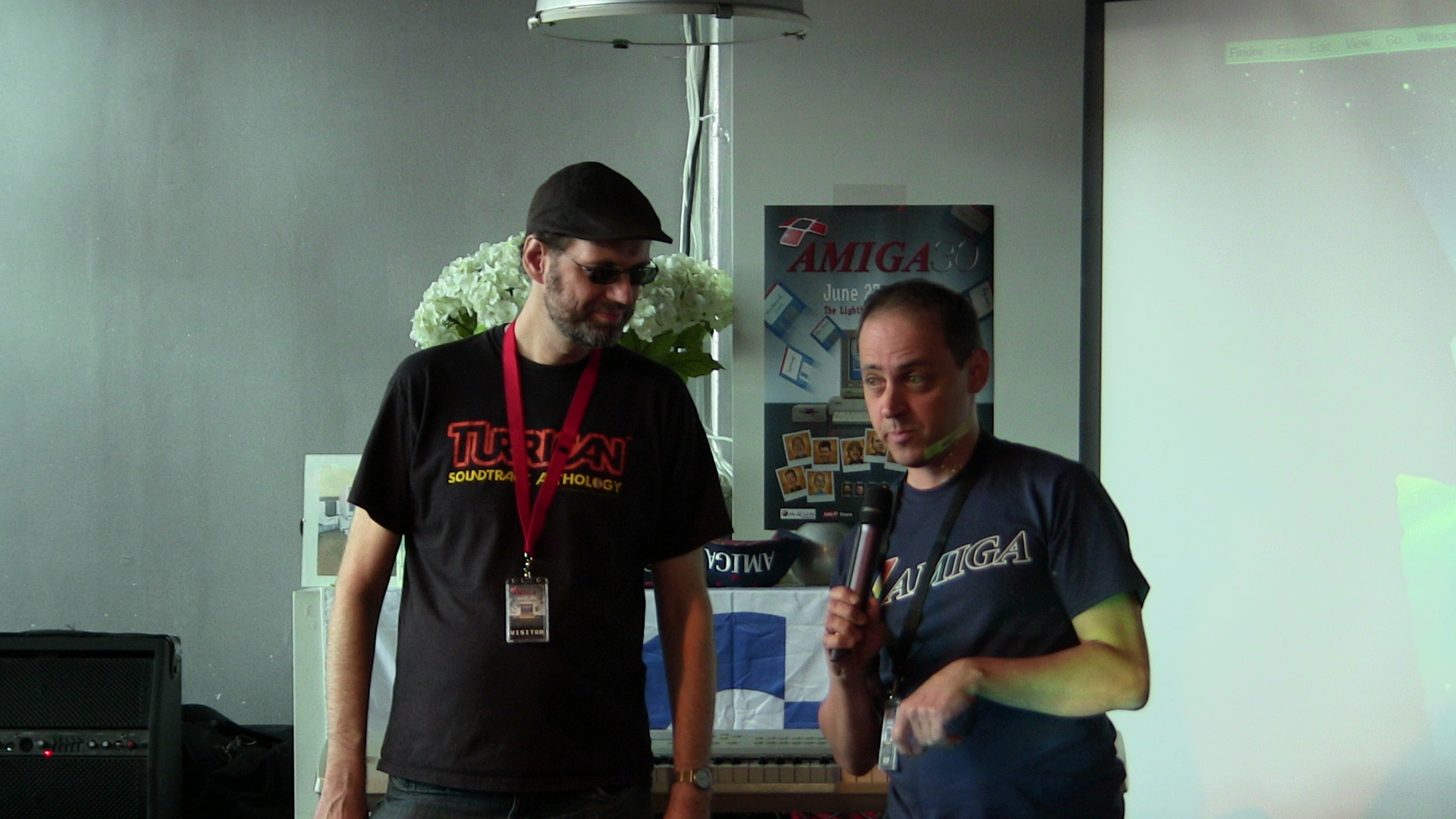 A l’intérieur du café se sont succédées quasiment sans interruption les présentations de nombreuses personnalités, qui se prêtaient aussi volontiers au jeu des questions réponses avec le public. Nous avons ainsi pu voir une présentation conjointe de trois anciens ingénieurs de Commodore, RJ Mical (créateur d’Intuition, le moteur de l’interface utilisateur de l’AmigaOS), Carl Sassenrath (créateur du noyau de l’AmigaOS) et Dave Haynie (qui a travaillé sur les Amiga 2000 et 3000 notamment). D’autres intervenants étaient présents comme le duo Chris Huelsbeck et Allister Brimble, deux des compositeurs majeurs des jeux Amiga (Turrican et Alien Breed, ce sont eux) ou Mike Dailly qui est revenu sur la genèse de Lemmings. Le café a également accueilli la diffusion de vingt minutes exclusives de Viva Amiga, un documentaire financé en 2011 via Kickstarter, et un set musical de DJ Echo qui clôturait la journée.